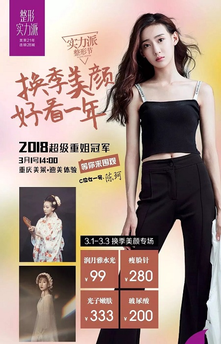 3月1日14:00,2018超級重姐勝者陳珂親臨重慶美萊并進行速美體驗直播。