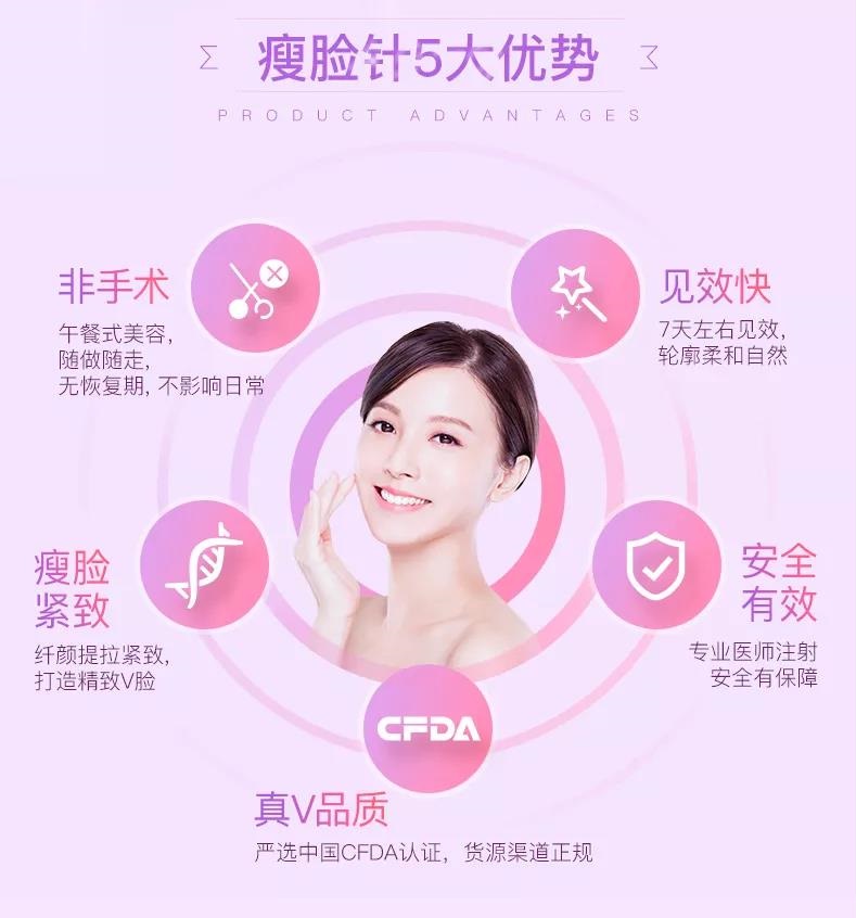 瘦臉屬于A型玻尿酸,作用于肌肉組織,可以讓肌肉變得松弛,其實(shí)就是麻痹比較發(fā)達(dá)比較壯的肌肉(如咬肌肥大),讓它沒(méi)有辦法運(yùn)動(dòng),較后肌肉就會(huì)萎縮,就get了瘦臉的效果,所以被稱為瘦臉。
