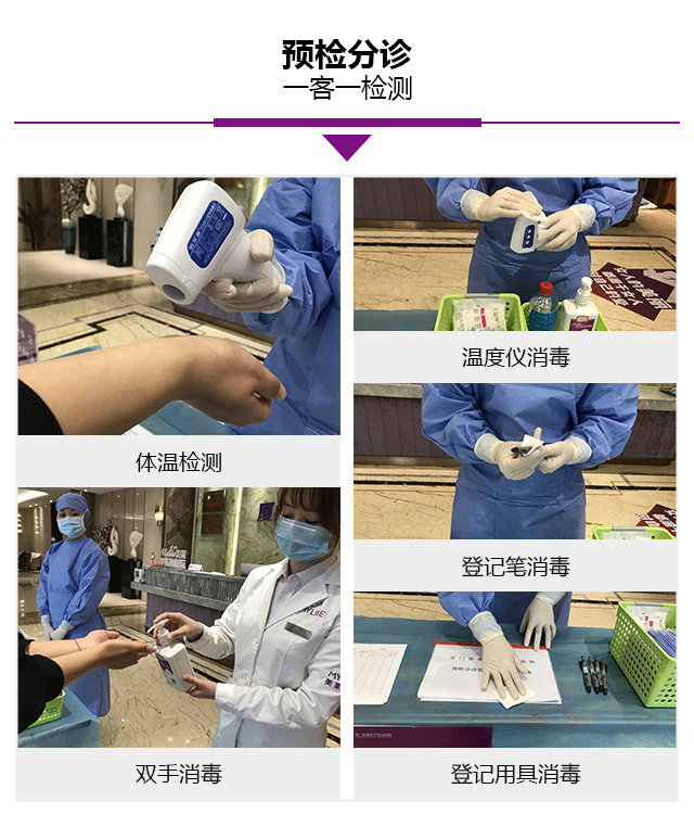 客戶到院流程嚴格管控,設置預檢分診臺,配備紅外線體溫槍、消毒液、體溫登記表等物品,登記”預檢分診發熱病例檢測本”,針對每一位進入本院的員工及求美者。