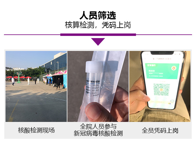 上崗人員篩選,復工人員均按政府嚴格篩選合格的健康員工,全員提前新冠病毒核酸檢測。